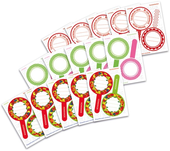 • Permanent zelfklevende, bont bedrukte papieren dekseletiketten.