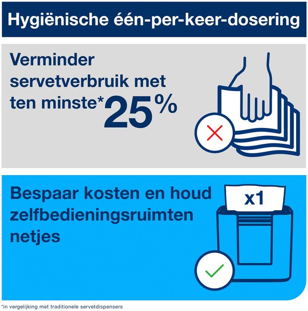 • Verminder verspilling en schoonmaaktijd in zelfbedieningsruimten. De dispenserservetten zijn praktisch en beschermend verpakt, zodat u ze eenvoudig kunt opslaan en volgens de hygiënenormen kunt hanteren. Dankzij de gebruiksvriendelijke één-per-keer-dosering wordt minstens 25% minder papieren servetten verbruikt vergeleken met traditionele servetdispensers.De voordelen op een rijtje: