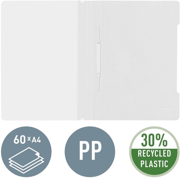 • Leitz standaard plastic witte offertemap, 30% pre-consumer gerecycled plastic. Mappen van topkwaliteit, gemaakt van 30% pre-consumer gerecycled plastic voor een betere bescherming van de inhoud.