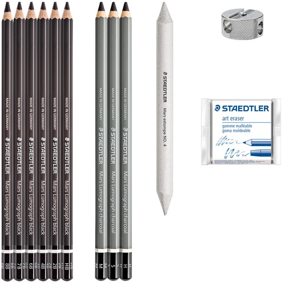 • Mars Lumograph charcoal 100C en Mars Lumograph black 100B voor zeer levendige resultaten en motieven met slechts enkele penstroken.