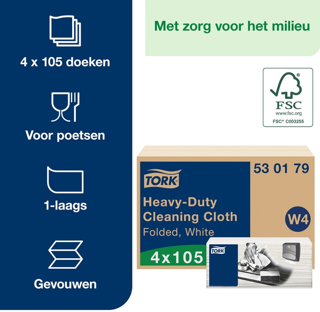 Reinigingsdoek Tork W4 Premium Heavy-Duty gevouwen 1-laags 4x105 vel wit 530179