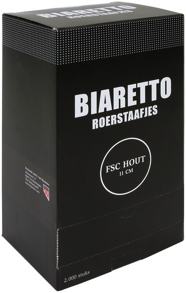 • De roerstaafjes Biaretto hout 11cm zijn een duurzaam en praktisch alternatief voor plastic roerstaafjes. Gemaakt van FSC-gecertificeerd hout en volledig plasticvrij, bieden deze bruine roerstaafjes een milieuvriendelijke oplossing voor het roeren van warme en koude dranken. Ideaal voor gebruik in kantines, koffiezaken, horeca of evenementen waar duurzaamheid en gemak hand in hand gaan. Dankzij de lengte van 11cm zijn ze perfect geschikt voor bekers tot middelgroot formaat. Met een inhoud van 2000 stuks ben je verzekerd van een ruime voorraad voor dagelijks professioneel gebruik.Kenmerken: