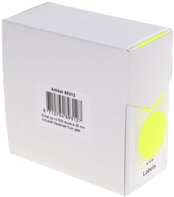 • Fluor gele ronde etiketten in kartonnen dispenser.