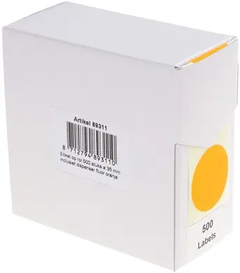 • Fluor oranje ronde etiketten in kartonnen dispenser.