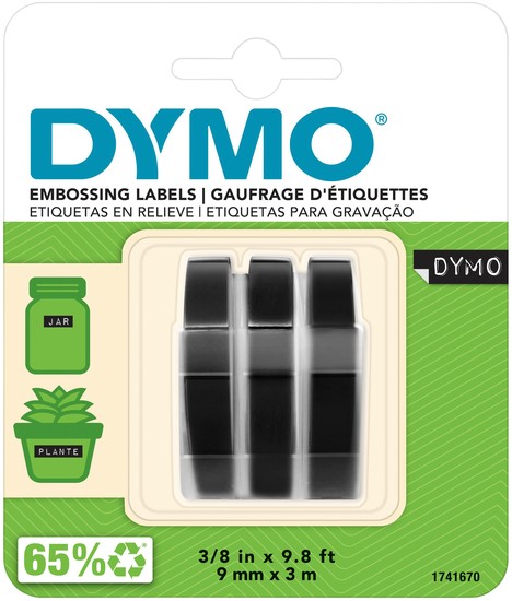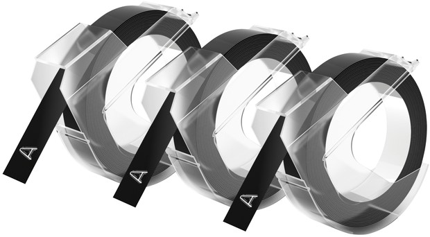 Reliëftape Dymo embossing plastic 9mm zwart op wit 3 stuks