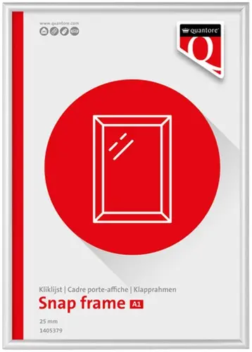 • Breng jouw posters en presentaties naar een hoger niveau met de Quantore Premium kliklijst in A1-formaat. Dit zilverkleurige frame van hoogwaardig aluminium combineert stijl en duurzaamheid, ideaal voor professioneel gebruik. De ontspiegelende, transparante folie beschermt je inhoud en zorgt ervoor dat deze vanuit elke hoek goed leesbaar blijft. Met een randbreedte van 25 mm en verborgen montagegaten biedt deze kliklijst een strakke, nette afwerking. Inclusief ophangmateriaal, waardoor het eenvoudig aan de muur te bevestigen is. Perfect voor snel en gemakkelijk wisselen van posters in kantoren, winkels of openbare ruimtes.Kenmerken: