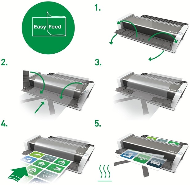 • Makkelijk inbrengen van het document dankzij het eenvoudige invoersysteem en de gepatenteerde unieke uitklapbare geleiders die consistente en hoge kwaliteit lamineren garandeert.