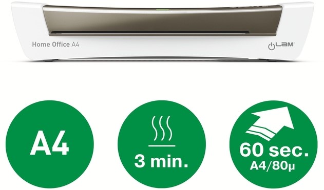 • Stijlvolle A4 lamineermachine in compact design beschikbaar in WOW-kleuren. Opwarmtijd slechts 3 minuten. Geschikt voor 80 tot 125 micron.