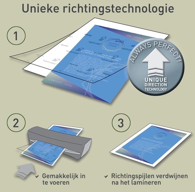 • Dankzij het ontwerp met UDT (Unique Direction Technology) zorgen pijlen op elke hoes ervoor dat ze correct worden ingevoerd voor een soepele, storingsvrije lamineerervaring.