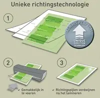 • Dankzij het ontwerp met UDT (Unique Direction Technology) zorgen pijlen op elke hoes ervoor dat ze correct worden ingevoerd voor een soepele, storingsvrije lamineerervaring.