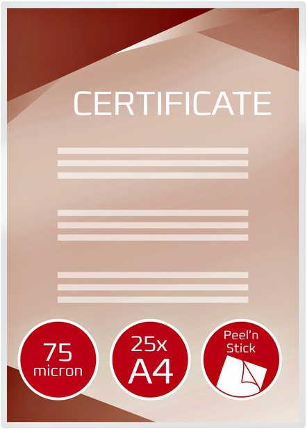 • Peel n' Stick-lamineerhoezen zijn ideaal om snel professionele, opvallende borden te maken. De kleeflaag hecht op de meeste materialen, waaronder glas, metaal en karton. U hoeft slechts het schutblad te verwijderen om de lamineerhoes op de gewenste ondergrond te plakken.