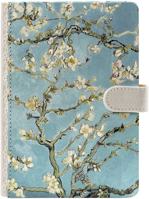 • Notitieboek met een schitterende tekening van Vincent van Gogh op de voor- en achterzijde met de bloesem van een fruitboom tegen een blauwe achtergrond.