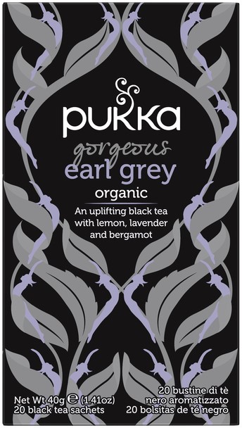 • Pukka Gorgeous Earl Grey is een blend met bergamot, zwarte theebladeren, lavendel en citroen.