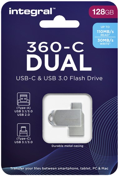 • De Integral 360-C Dual USB-C Flash Drive biedt compatibiliteit tussen smartphones, tablets, pc's en Macs.