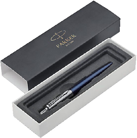 • Hij is voorzien van een medium punt, een blauwe schrijfkleur en geschikt voor de navullingen van Parker. De pen wordt geleverd in een Parker geschenkdoos.