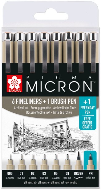 • De set bevat 1 Pigma Micron 005 (0,2 mm), 1 Pigma Micron 01 (0,25 mm), 1 Pigma Micron 02 (0,30 mm), 1 Pigma Micron 03 (0,35 mm), 1 Pigma Micron 05 (0,45 mm), 1 Pigma Micron 08 (0,50 mm), 1 Pigma Penseel-pen en 1 Pigma Micron pen 0,4/0,5mm.