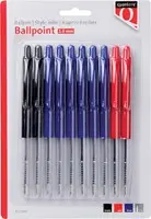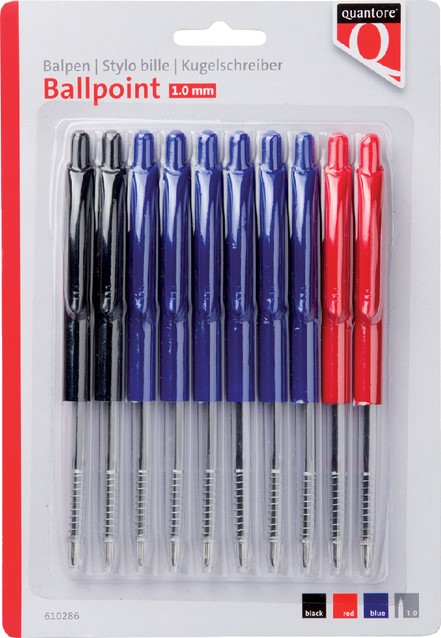 • De Quantore drukknop assorti balpennen zijn een praktische keuze voor dagelijks gebruik op school, kantoor of thuis. Deze set van 10 pennen bevat een handige mix van schrijfkleuren: 6x blauw, 2x zwart en 2x rood—zo heb je altijd de juiste kleur bij de hand. De transparante kunststof houder laat duidelijk zien hoeveel inkt je nog hebt, terwijl het zijdelingse drukknopsysteem zorgt voor extra gebruiksgemak. Met de medium schrijfpunt van 0,7mm geniet je van een vloeiende en consistente schrijfervaring. De kunststof clip maakt het eenvoudig om de pen overal mee naartoe te nemen.Kenmerken: