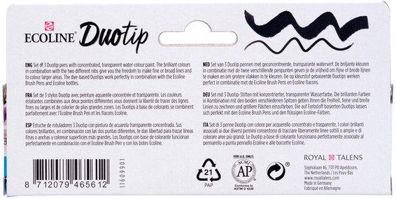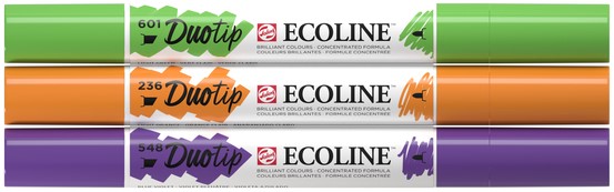 • De op kleurstof gebaseerde Duotips werken perfect in combinatie met de Ecoline Brush Pens en Ecoline flacons en bieden je een breed scala aan opties in lijndiktes, stijlen en kleurvariaties.
