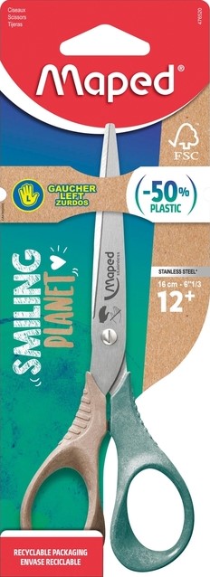 • De Smiling Planet Shape schaar linkshandig 16cm heeft ergonomische ringen gemaakt van 50% houtvezel FSC Mix.