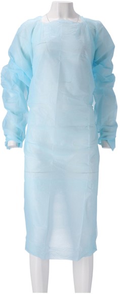 Schort CMT 115x105cm 30mu geruwd lange mouw CPE blauw 20 stuks