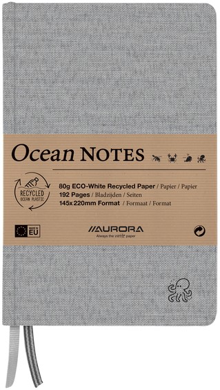 • Bovendien werd gekozen voor een wit gerecycleerd schrijfpapier. Op de grijze kaft is het icoontje van een octopus terug te vinden. De Ocean Notes is meer dan een notebook, het is een symbool van posittieve verandering, doe je mee?