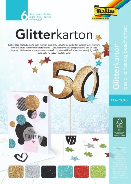 • Glitterkarton in 6 basiskleuren.