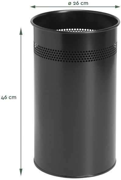 • De prullenmand kan ook als afvalbak gebruikt worden en is voorzien van een sterke epoxy laklaag. De poedercoating is van hoogwaardige kwaliteit. Deze bin heeft een doorsnede van Ø26cm en is 46cm hoog.