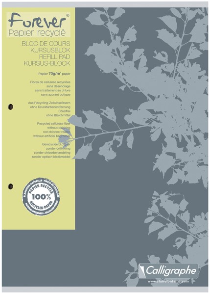 • FOREVER gerecycled cursusblok A4 70g 100 blad - 2 gaats perforatie Q5x5mm + kantlijn Een uniek assortiment gemaakt van 100% gerecycled papier met natuurlijke witheid, zonder ontinkting of optische witmakers.De FOREVER-kwaliteit is gemaakt van 100% post-consumer oud papier in onze Everbal-fabriek in Frankrijk. Bijzonderheid: de papiermachine wordt gevoed door hernieuwbare energie, verwarming met biomassa van fossiele oorsprong zonder CO2-uitstoot. Uitscheurbare en geperforeerde bladen met 2 gaten van 80 mm om gemakkelijk in een ordner of ringband te integreren. 70 g papier 100% gerecycled, met natuurlijke witheid. Gerecyclede omslag