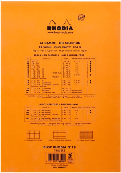 • Rhodia notitieblok N°18, 21x29,7 cm, 80 vel gelijnd papier met marge. Ultra-functioneel, het Rhodia notitieblok is "De" referentie voor geniete notitieblokken! 80 afscheurbare vellen met microperforatie. Stevige kartonnen basis zodat je zelfs zonder steun notities kunt maken. Clairefontaine 80gr fijn vellum papier, PEFC gecertificeerd.