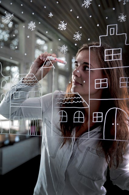 • Voor het niet-permanent ontwerpen, decoreren en beschrijven van gladde ondergronden bijvoorbeeld ramen, (school)borden, glas, plexiglas® en spiegels.