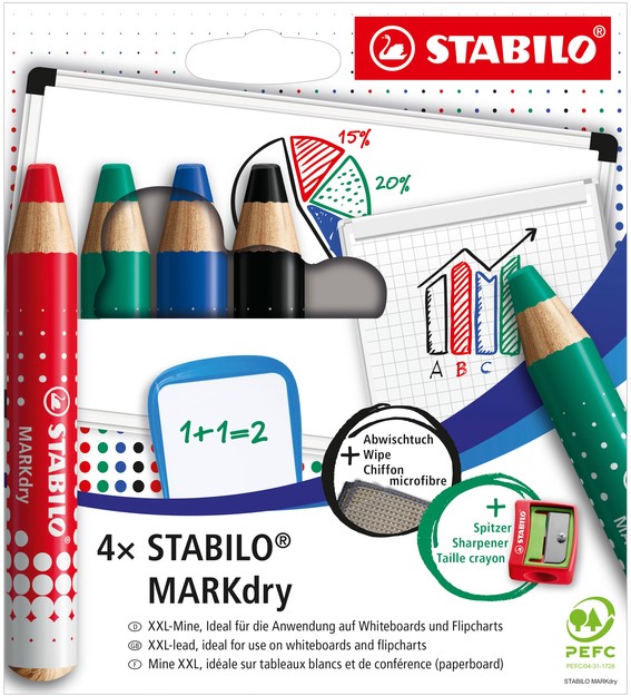 Whiteboardpotlood STABILO MARKdry 648/4 + slijper-microvezel ass 4st