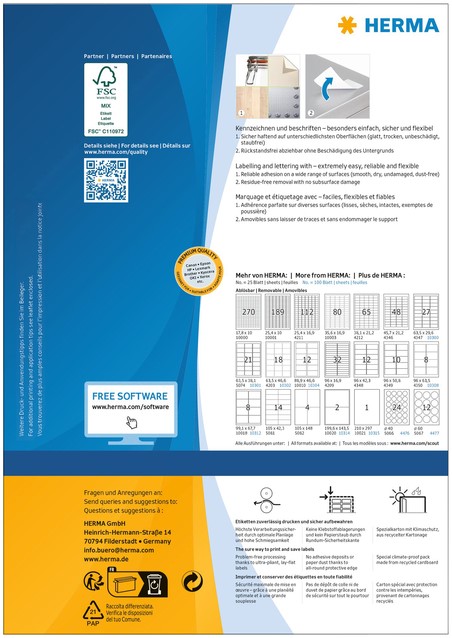 • Zelfklevende etiketten op A4-vellen, Ø 60 mm rond wit verwijderbaar, 100 vel per verpakking. Stevig hechtend op alle gladde, droge, onbeschadigde en stofvrije oppervlakken. Te verwijderen zonder resten achter te laten en zonder de ondergrond te beschadigen. Ideaal voor het tijdelijk of wisselend labelen en voor oppervlakken die niet mogen worden beschadigd. Zeer goede drukresultaten op alle laser- en inkjetprinters, kopieerapparaten, kleurenlaserprinters en kleurenkopieerapparaten. Storingvrije verwerking dankzij veiligheidsrand rondom en optimale vlakligging. Milieuvriendelijk: FSC® Mix Credit-gecertificeerd, chloorvrij gebleekt, oplosmiddelvrije contactlijm. Etiketten zijn 100 % recyclebaar via het oud papier, verpakking van gerecycled karton. Gratis softwareoplossingen: www.herma.com/software.