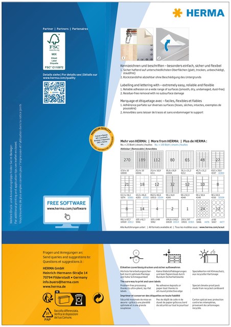 • Zelfklevende etiketten op A4-vellen, etiketformaat 63,5x38,1mm wit verwijderbaar, 100 vel per verpakking. Stevig hechtend op alle gladde, droge, onbeschadigde en stofvrije oppervlakken. Te verwijderen zonder resten achter te laten en zonder de ondergrond te beschadigen. Ideaal voor het tijdelijk of wisselend labelen en voor oppervlakken die niet mogen worden beschadigd. Zeer goede drukresultaten op alle laser- en inkjetprinters, kopieerapparaten, kleurenlaserprinters en kleurenkopieerapparaten. Storingvrije verwerking dankzij veiligheidsrand rondom en optimale vlakligging. Milieuvriendelijk: FSC® Mix Credit-gecertificeerd, chloorvrij gebleekt, oplosmiddelvrije contactlijm. Etiketten zijn 100 % recyclebaar via het oud papier, verpakking van gerecycled karton. Gratis softwareoplossingen: www.herma.com/software.