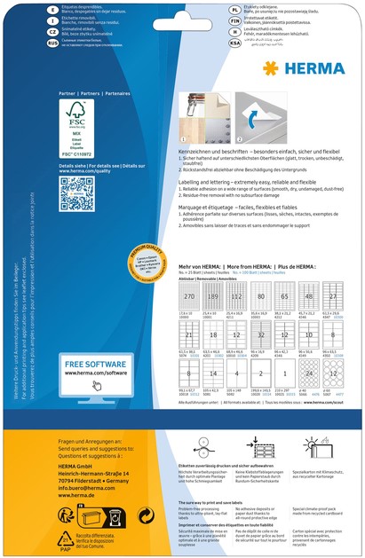 • Zelfklevende etiketten op A4-vellen, etiketformaat 17,8x10mm wit verwijderbaar, 25 vel per verpakking. Stevig hechtend op alle gladde, droge, onbeschadigde en stofvrije oppervlakken. Te verwijderen zonder resten achter te laten en zonder de ondergrond te beschadigen. Ideaal voor het tijdelijk of wisselend labelen en voor oppervlakken die niet mogen worden beschadigd. Zeer goede drukresultaten op alle laser- en inkjetprinters, kopieerapparaten, kleurenlaserprinters en kleurenkopieerapparaten. Storingvrije verwerking dankzij veiligheidsrand rondom en optimale vlakligging. Milieuvriendelijk: FSC® Mix Credit-gecertificeerd, chloorvrij gebleekt, oplosmiddelvrije contactlijm. Etiketten zijn 100 % recyclebaar via het oud papier, verpakking van gerecycled karton. Gratis softwareoplossingen: www.herma.com/software.