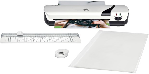 • Set bestaat uit: 1x GBC Inspire+ A4 lamineermachine (wit), 1x hoeksnijder om scherpe randen en hoeken bij te snijden, 1x papier rolsnijmachine om documenten eenvoudig en veilig op het gewenste formaat te snijden, 5x starterpakket lamineerhoezen (2x75micron).