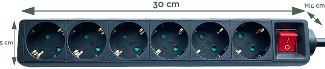 • De stekkerdoos met 6 sockets, die geschikt is voor binnenshuis gebruik, is voorzien van geaarde stopcontacten. Hij heeft een compacte afmeting van 30 x 5 x 4 cm en biedt dus een oplossing voor de meest krappe ruimtes. De stekkerdoos is direct klaar om te gebruiken en geschikt voor geaarde en niet-geaarde apparaten.