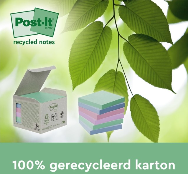 • Post-it® Recycled Super Sticky Notes zijn gemaakt van 100% gerecycled papier en kunnen zelf ook worden gerecycled.