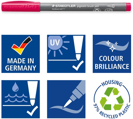 • Hoogwaardige viltstiften met penseelpunt en de innovatieve Multi Ink inkt - gebaseerd op premium pigmenten die een extreme lichtechtheid en uitzonderlijk briljante kleuren bieden.