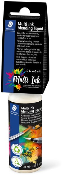 • Staedtler Multi Ink blending liquid. Deze blender lost de permanente Multi Ink op: Hiermee kunnen kleuren worden gemengd, gladde kleurovergangen en gradients worden gecreëerd, evenals aquarel- en ombré-effecten. Kleuren kunnen worden opgefrist: kan worden gebruikt om lichtreflecties te creëren en zelfs om kleine foutjes te corrigeren. Blender op waterbasis met een lage geur. Optimale resultaten kunnen worden bereikt op aquarelpapier en op niet-absorberende oppervlakken. Breng eenvoudigweg de mengvloeistof aan met een kwast of vul de tank van een waterkwast.