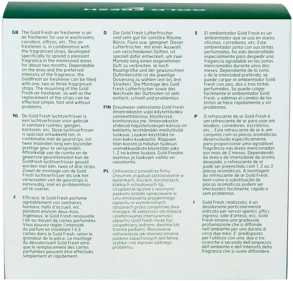 • De Gold Fresh is een luchtverfrisser voor gebruik in sanitaire ruimtes, gangen, kantoren, etc. Deze luchtverfrisser is speciaal ontwikkeld om, in combinatie met de geurstrips, tot twee maanden lang een bijzonder prettige geur te verspreiden.