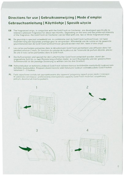 • Deze luchtverfrisser is speciaal ontwikkeld om, in combinatie met de geurstrips, tot twee maanden lang een bijzonder prettige geur te verspreiden. Afhankelijk van de ruimte en de gewenste geurintensiteit kan de Gold Fresh luchtverfrisser gevuld worden met één, twee of drie strips.