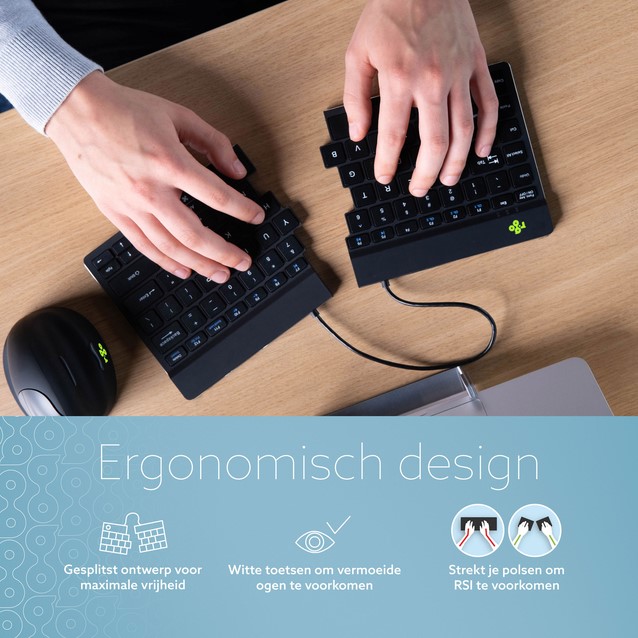• Het R-Go Split Break toetsenbord is een ergonomisch gesplitst toetsenbord met geïntegreerde pauzesoftware. Dit toetsenbord stimuleert je om regelmatig pauzes te nemen. Zo blijft de doorbloeding van je lichaam op peil, voorkom je overbelasting en blijf je fit tijdens je werkdag.