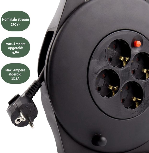 • Max. Ampere opgerold: 4,8A Max. Ampere uitgerold: 13,1A