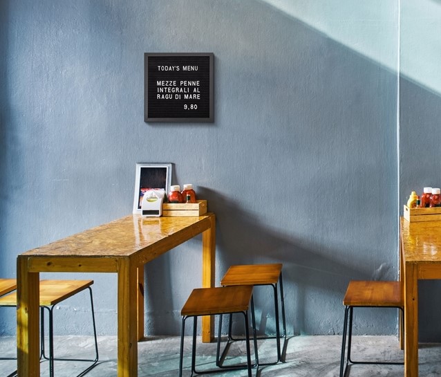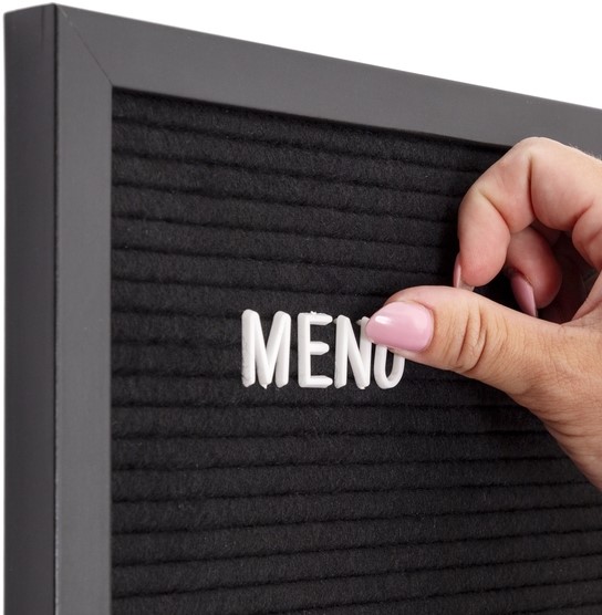 • Breng je boodschap stijlvol en compact over met het IEZZY letterbord 30x30cm zwart hout. Dit vierkante vintage designbord heeft een zwarte vilten achtergrond in combinatie met een strak zwart houten frame, wat zorgt voor een moderne en elegante uitstraling. Ideaal voor korte boodschappen, prijsaanduidingen of quotes in horecazaken, winkels, kantoren of thuis. Dankzij de meegeleverde 330 witte kunststof letters en 120 cijfers stel je eenvoudig een opvallende en goed leesbare tekst samen. De letters zijn snel te plaatsen en weer te verwijderen, waardoor je flexibel blijft in je communicatie. Perfect voor wandmontage of presentatie op een balie of plank.Kenmerken:
