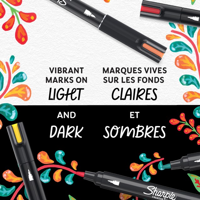 • Breng uw artistieke visie tot leven met de Sharpie Creative Markers! Deze acrylmarkers zijn gevuld met een prachtige verfachtige inkt die moeiteloos over de pagina glijdt, maar de controle van een marker biedt. De inkt op waterbasis loopt niet door het papier, zodat uw lijnen strak blijven. Met de felle kleuren maakt u levendige creaties op lichte en donkere oppervlakken op papier, metaal, hout, keramiek, glas, steen en canvas. De kleuren kunnen gemakkelijk in lagen worden aangebracht om meer dimensie aan uw werk te geven. Bovendien hoeft u deze markers met ronde punt niet te schudden; dop eraf en aan de slag!