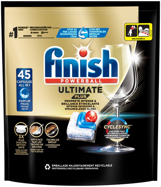 • Met Finish Ultimate Plus all in one infinity shine, krijg je een ultieme glans en uitzonderlijke reiniging de eerste keer, elke keer! Onze nieuwe CYCLESYNC-technologie geeft de ingrediënten na elkaar vrij voor een optimale wasbeurt. Dankzij de 4 acties tijdens de hele wascyclus is deze unieke technologie zelfs effectief tegen aangebrande vlekken, zonder dat je hoeft voor te spoelen.