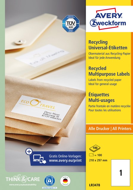 Etiket Avery Zweckform LR3478 210x297mm A4 recycled wit 100 etiketten