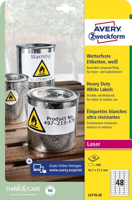 Etiket Avery L4778-20 45.7x21.2mm polyester wit 960 stuks