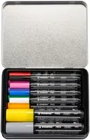 • Starter kit in een metalen blik met 11 stuks met 3 verschillende punten en 11 verschillende kleuren: 4x T100 in wit (700), donkerblauw (32), taffy pink (762), zwart (746). 5x T300: oranje (754), blad groen (743), paars (755), lila (758), rood (748). 2x T800: donkergrijs (769), geel (744).