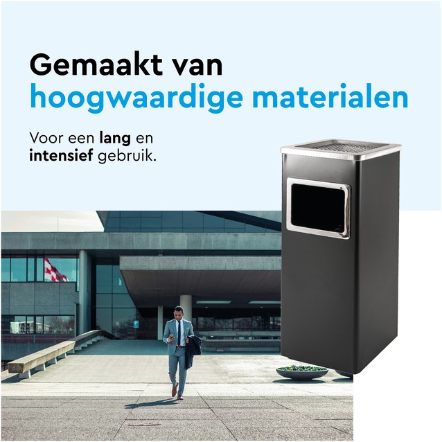 • Met zijn elegante vierkante ontwerp en praktische functies is deze zwarte prullenbak met asbak een must-have voor elke (openbare)ruimte, zowel binnen als buiten. Bestel vandaag nog en geniet van een gebruiksvriendelijke en stijlvolle oplossing voor al je afval- en sigarettenrestbeheer.